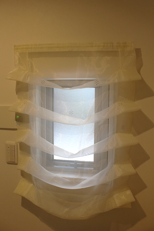 こちらのお宅の小窓は、サテン地の生地で、ヒダはギャザーでお作りしました。
